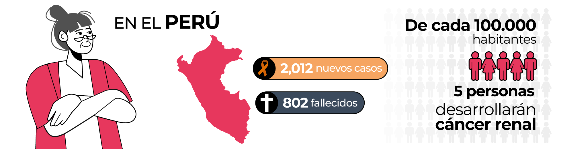 El cáncer renal afecta a muchas personas en el Perú. En el año 2022, se diagnosticaron 2,012 nuevos casos de esta enfermedad en el país y 802 personas fallecieron debido a ella. Para ponerlo en perspectiva, por cada 100,000 habitantes, alrededor de 5 personas desarrollan cáncer renal cada año. (3)
