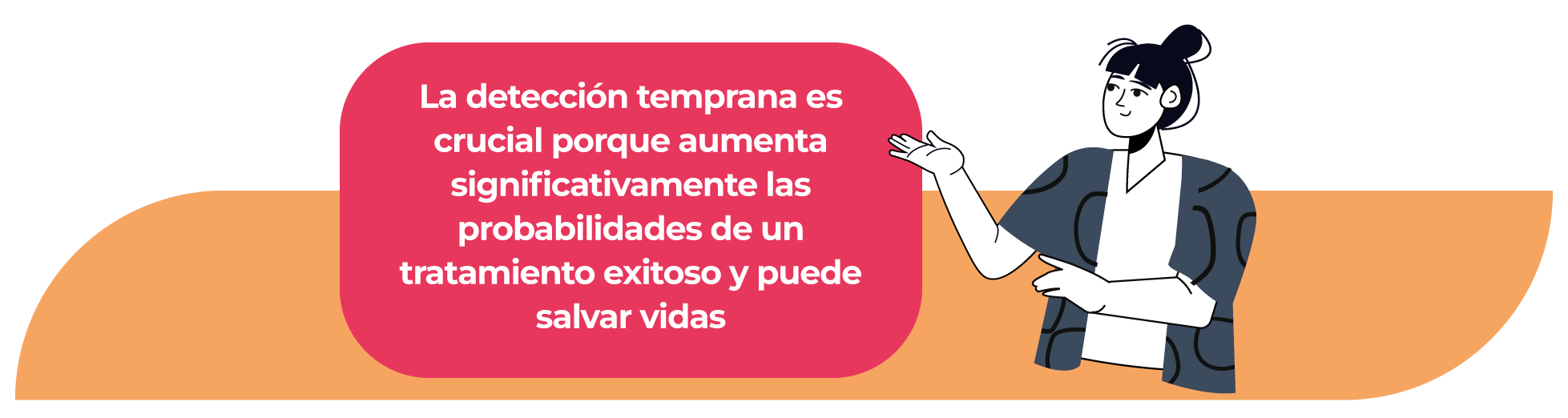 Las pruebas de detección son fundamentales para identificar el cáncer de mama en sus primeras etapas, antes de que aparezcan síntomas visibles. La detección temprana es crucial porque aumenta significativamente las probabilidades de un tratamiento exitoso y puede salvar vidas. Cuando el cáncer de mama se detecta en una etapa temprana, hay más opciones de tratamiento disponibles, y la enfermedad tiene mayores posibilidades de sobrevida, es decir, menor probabilidad de tener metástasis. (9)