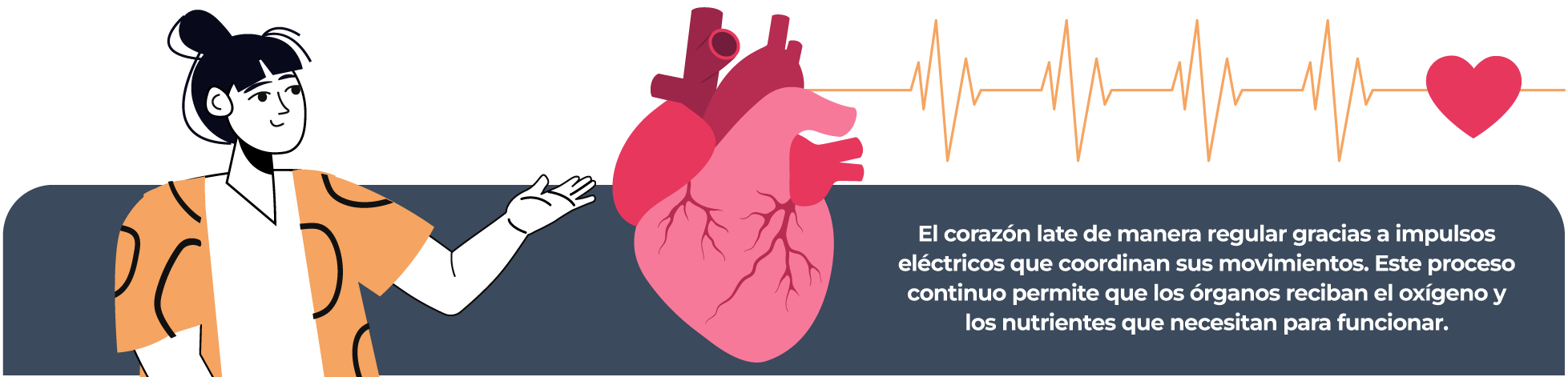 El corazón late de manera regular gracias a impulsos eléctricos que coordinan sus movimientos. Este proceso continuo permite que los órganos reciban el oxígeno y los nutrientes que necesitan para funcionar. (2)