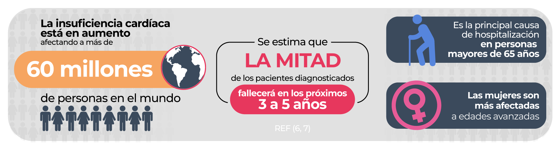 La insuficiencia cardíaca está en aumento, afectando a más de 60 millones de personas en el mundo. Se estima que la mitad de los pacientes diagnosticados fallecerá en los próximos 3 a 5 años. Además, el 30% de los pacientes vuelven a ser hospitalizados en los primeros 90 días tras su alta.