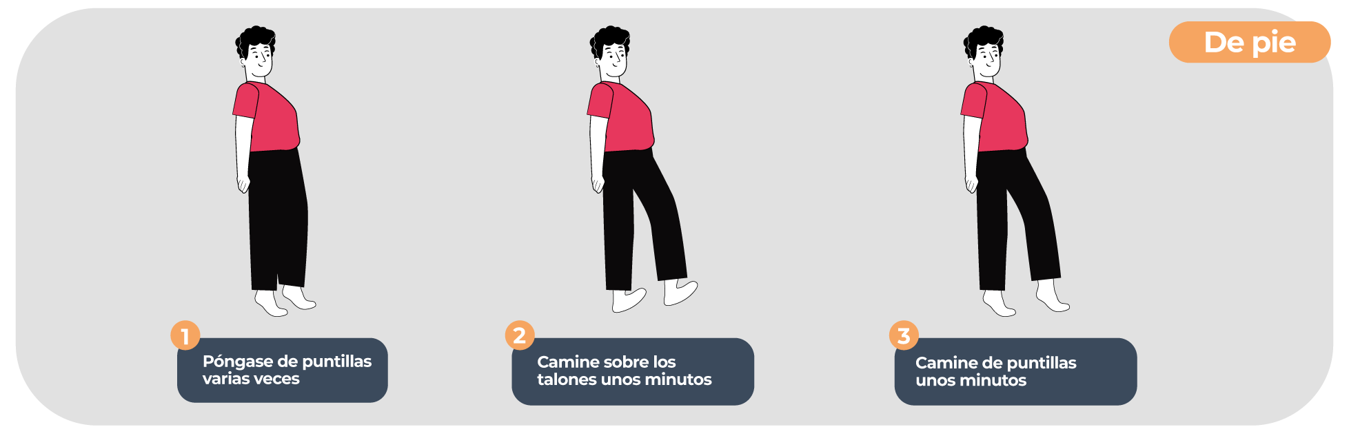 - Evita estar sentado o de pie por tiempos prolongados. Si trabajas muchas horas en una misma posición, intenta moverte o estirar las piernas.
