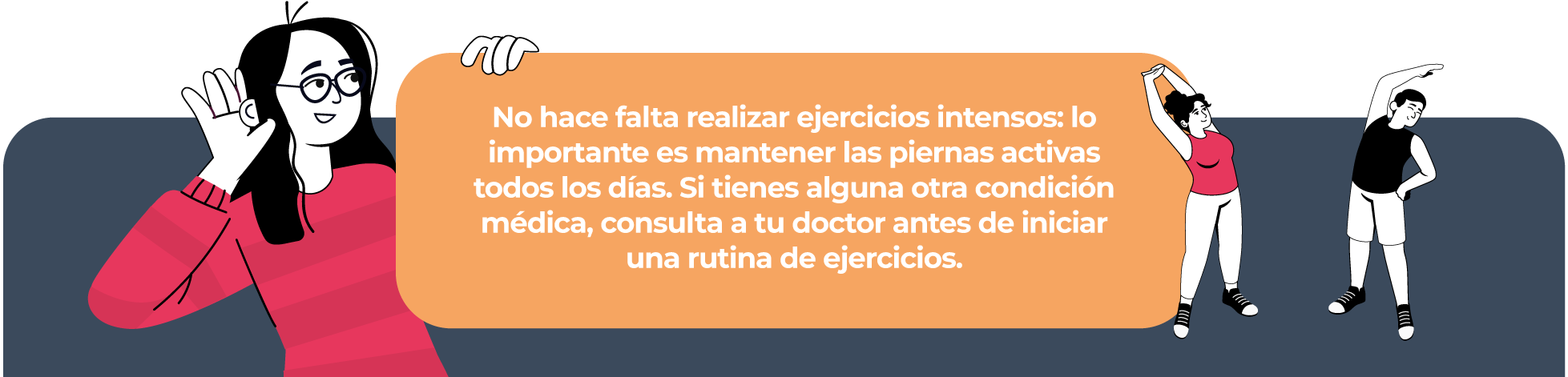 - Mantenerse activo: Caminar, nadar o andar en bicicleta mejora la circulación al activar los músculos de la pantorrilla. Siempre consulta con tu médico sobre cuál es el mejor ejercicio para tu condición.